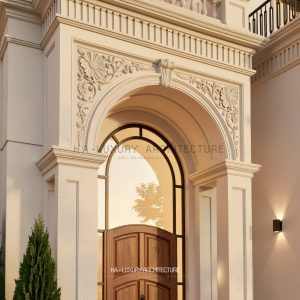▪️Mặt tiền gây ấn tượng mạnh mẽ với hệ vòm cong uyển chuyển – chi tiết đặc trưng của kiến trúc châu Âu cổ điển, kết hợp cùng hệ cột và ban công sắt nghệ thuật, tạo nên chiều sâu thị giác và sự mềm mại trong từng góc nhìn. Tông màu trắng kem thanh lịch được điểm xuyết bởi ánh đèn vàng ấm áp, làm nổi bật từng chi tiết kiến trúc khi chiều buông, mang đến cảm giác ấm cúng nhưng vẫn đầy quyền quý.
