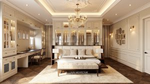 Phòng ngủ chính mang tinh thần truyền thống với hệ phào chỉ tinh xảo, vòm cong mềm mại và bảng màu kem – be ấm áp, tạo nên cảm giác thư thái tuyệt đối. Ánh sáng vàng dịu từ đèn chùm pha lê lan tỏa khắp không gian, phản chiếu trên các bề mặt hoàn thiện cao cấp, mang lại chiều sâu và sự sang trọng đầy cuốn hút. Nội thất được lựa chọn với đường nét cổ điển chuẩn mực, cân đối và trang nhã, khẳng định gu thẩm mỹ tinh tế của gia chủ.