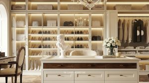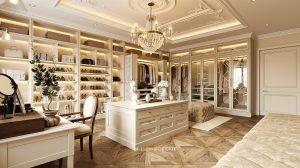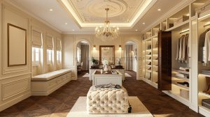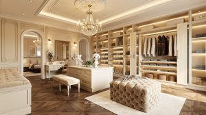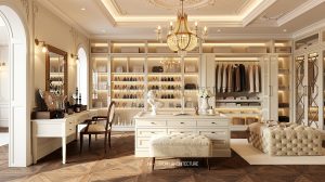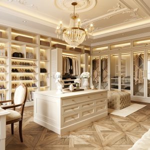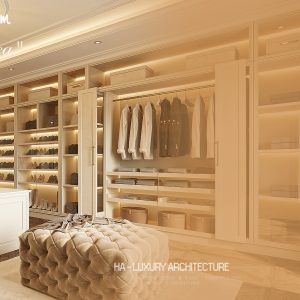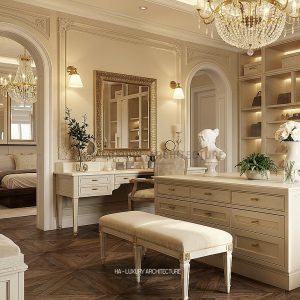 Liền kề là khu dressing room – nơi tái hiện chuẩn mực của những phòng thay đồ hoàng gia châu Âu. Hệ tủ âm tường được thiết kế đối xứng, kết hợp ánh sáng LED âm tinh tế giúp tôn vinh từng chất liệu và phụ kiện. Đảo trung tâm không chỉ là điểm nhấn thẩm mỹ mà còn tối ưu công năng, mang lại trải nghiệm sử dụng tiện nghi và đẳng cấp. Sàn gỗ xương cá cùng các chi tiết bọc nỉ, da cao cấp góp phần hoàn thiện không gian ấm áp nhưng vẫn đầy quyền quý.